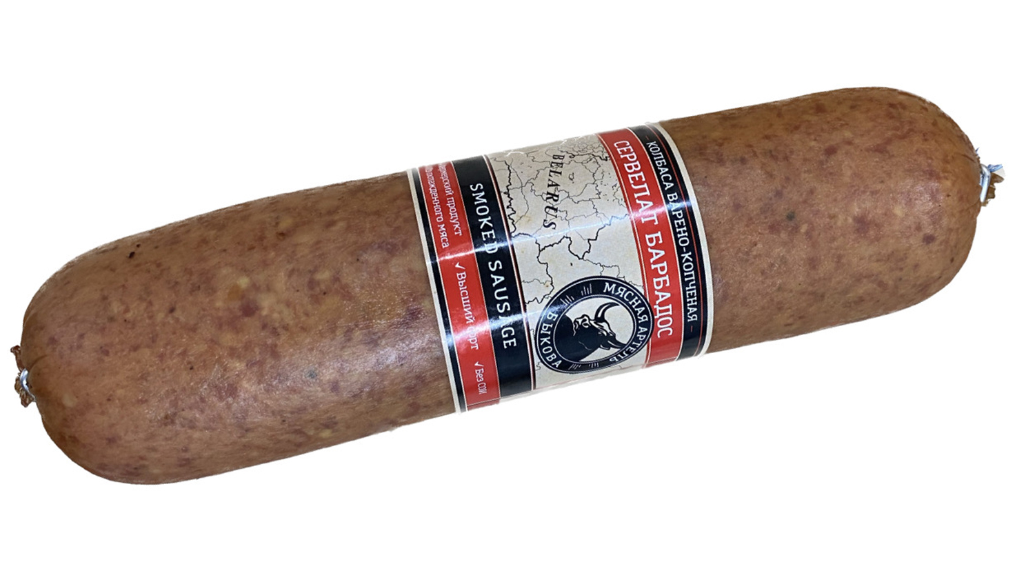 Варено-копченое колбасное изделие салями мясное. Колбаса «Сервелат Барбадос» высшего сорта Упаковка / Оболочка: Иск. об. Срок годности, суток: 25